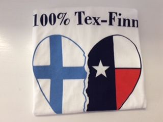 A white t-shirt with both the Finnish and Texan flags in a heart design. Exclusive of the Wooden Spoon.