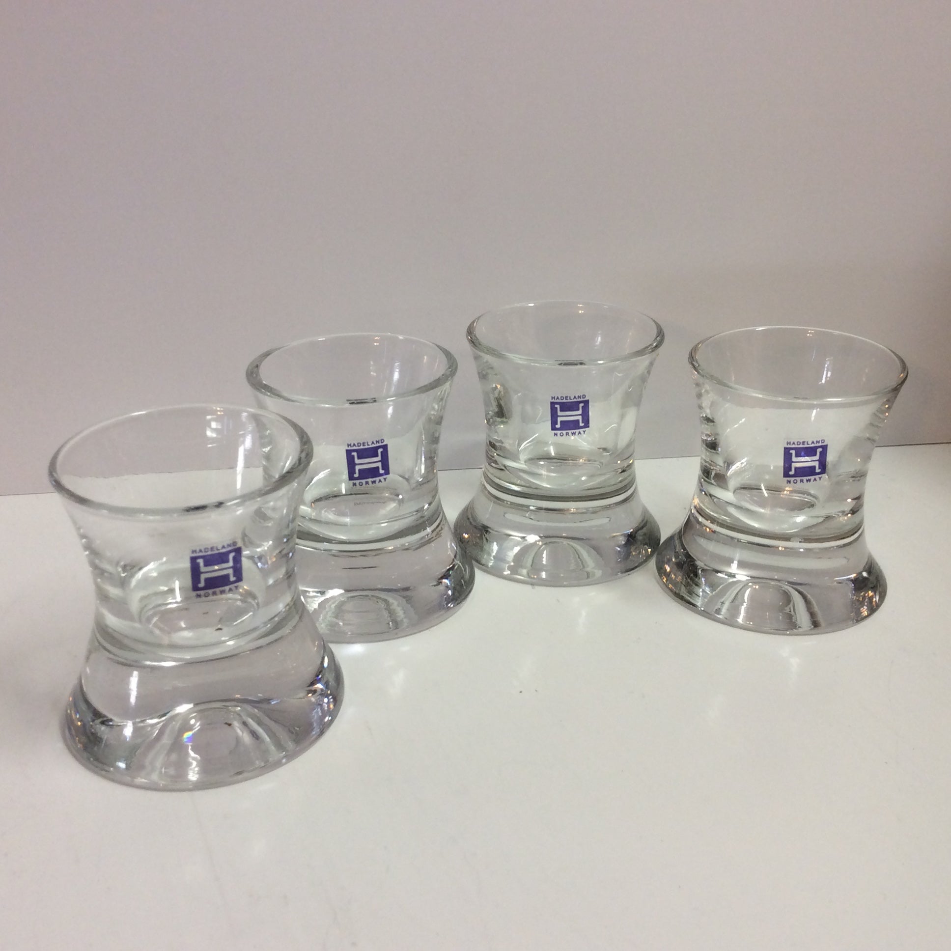 A set of four egg cups/snapps glasses. Can also be used as egg cups. Each stand about two inches tall. Made in Norway by the Hadeland Company.