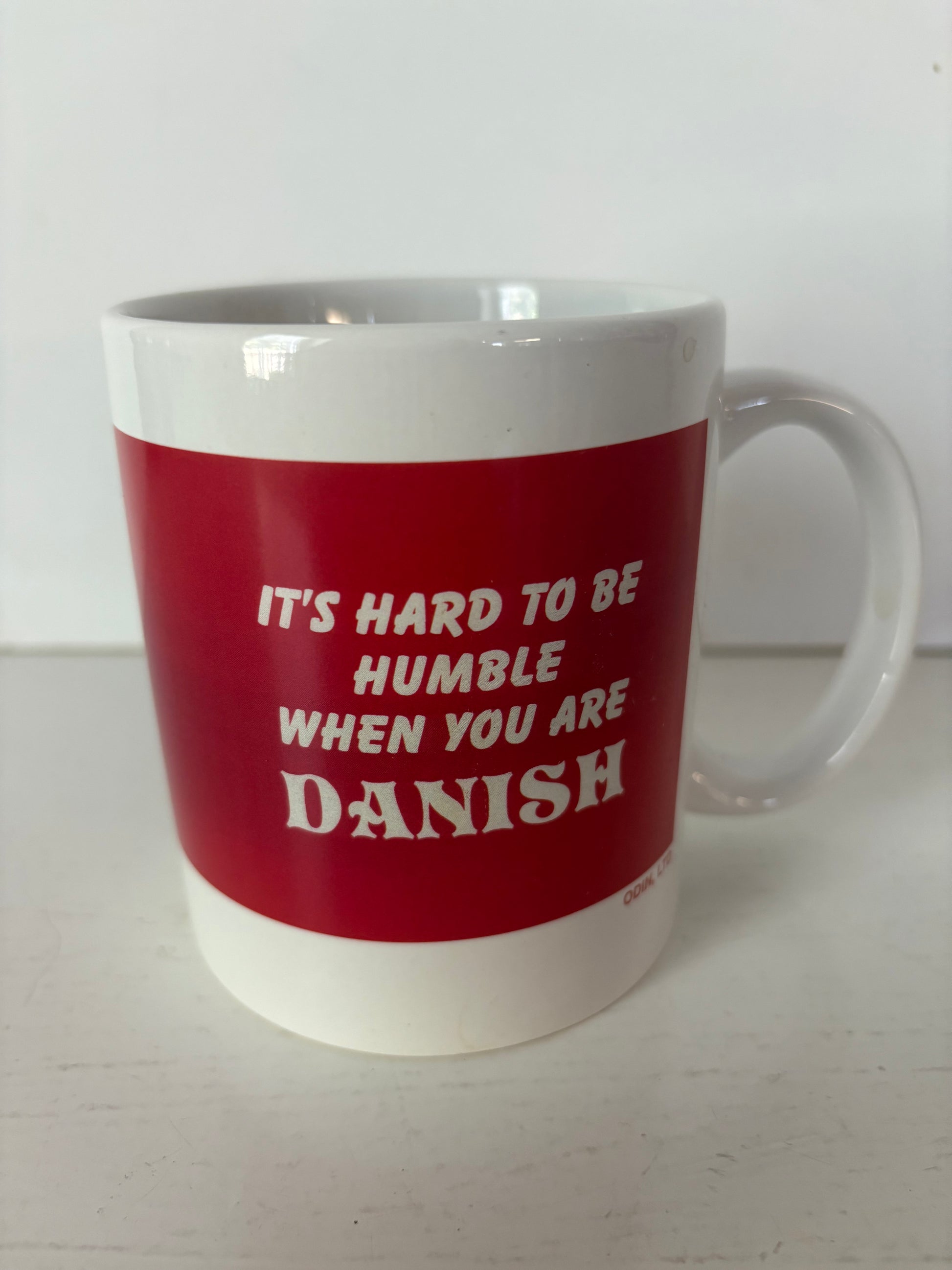 A ceramic mug "It's hard to be humble when you are Danish". Microwave safe. A good size cup that will hold one-and one-half cups. A fun cup to own or give.