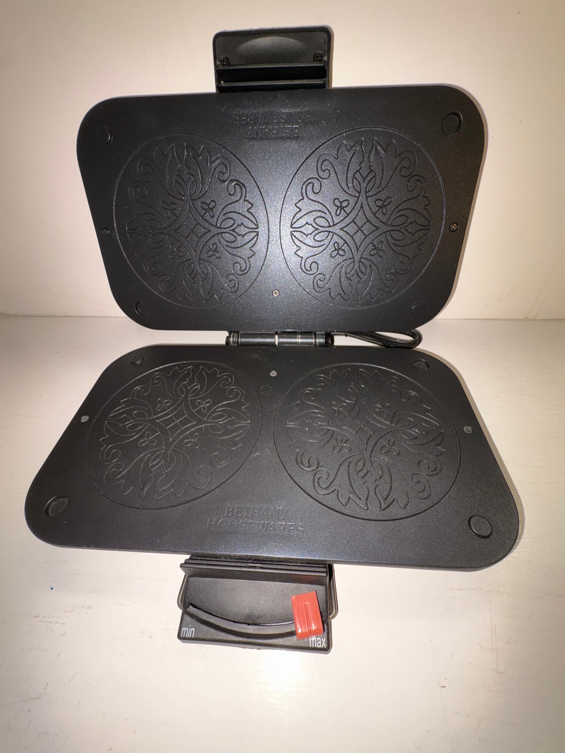 An electric, non-stick appliance to make the krumkage. Ann makes them by the dozens each year, using this iron. It is very durable and long lasting. It comes with one cone so you may want to order another. We carry the wooden ones.