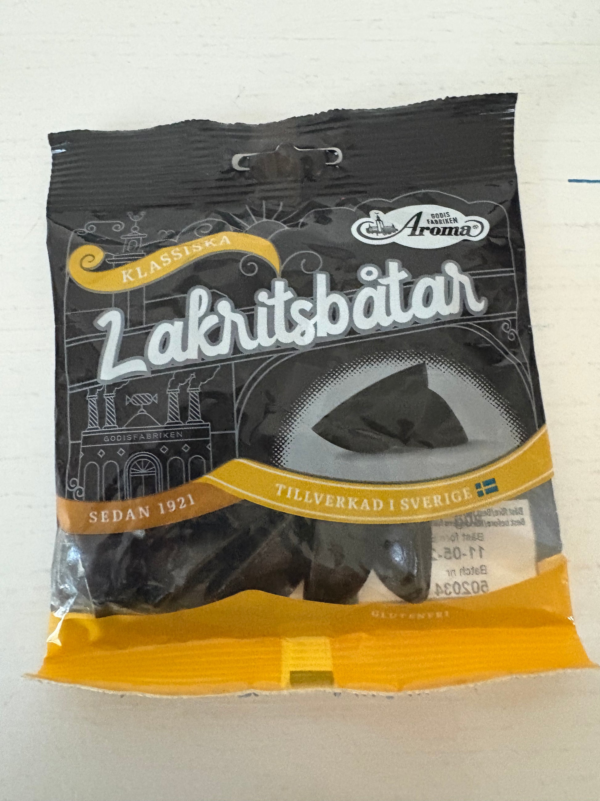 Lakritsbatar, licorice from Sweden. Company has been making it since 1921. Each package contains 80 grams
