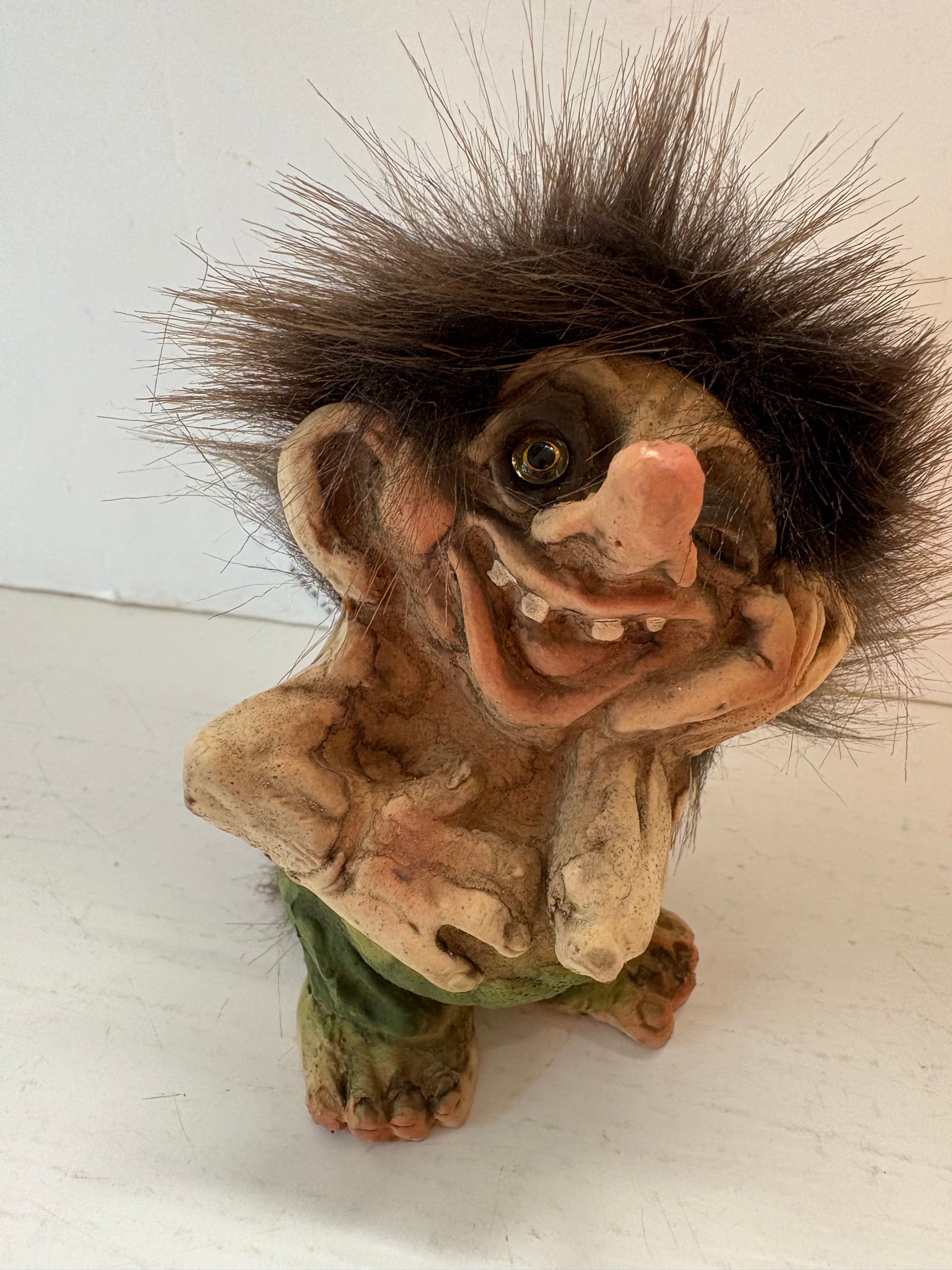 A playful troll who just told a funny joke. We don't know who enjoyed it more, him or his audience. He stands about three inches tall and will bring a smile to your face each time you look at him. From the Nyform Company in Norway.