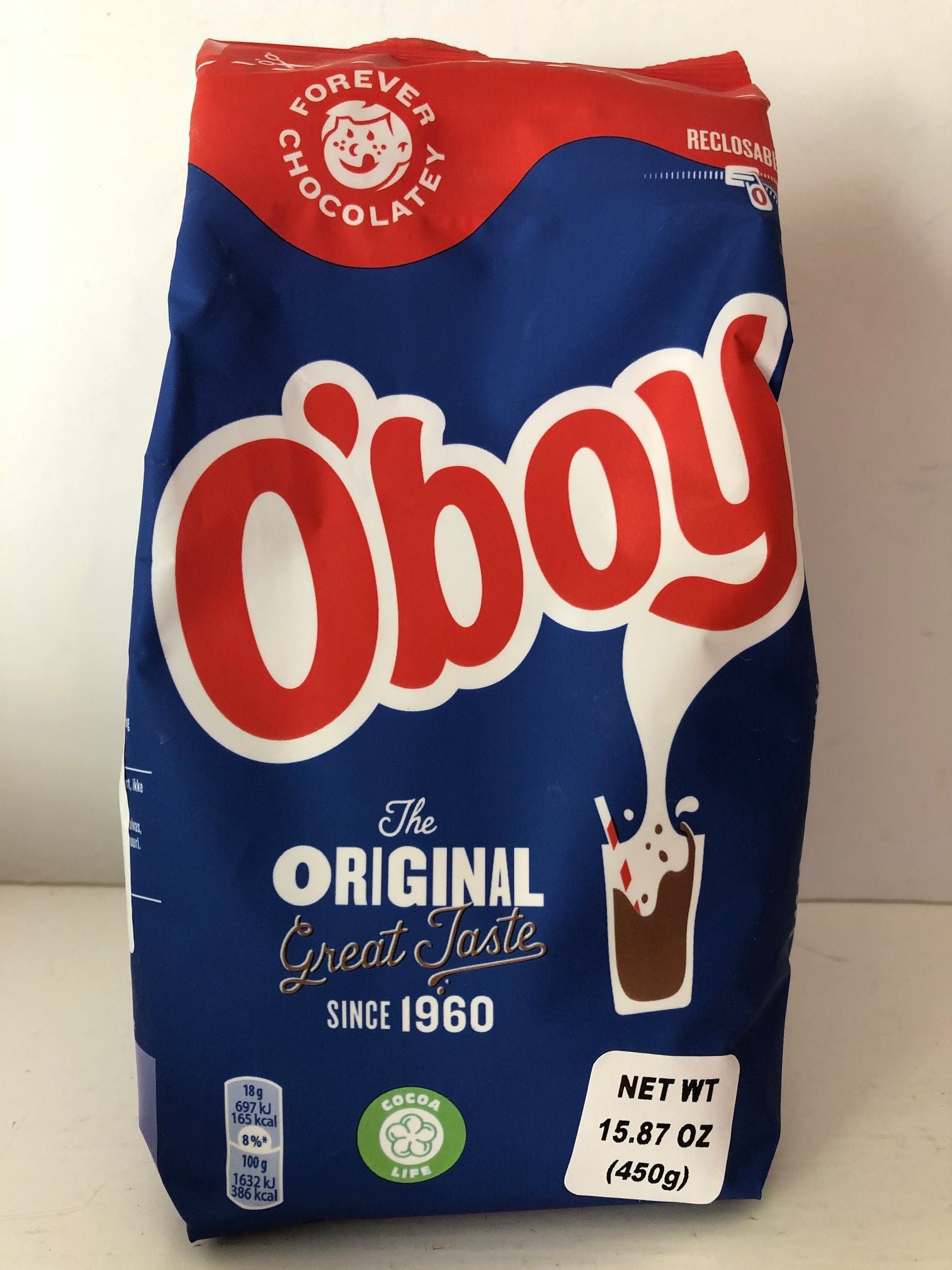 O'Boy cocoa powder, 450 grams, 15.87 oz. The best hot/cold chocolate mix on the market. Mix the powder with warm or cold milk and serve with your favorite cookies or toast and lingonberries. Not too sweet. Made with creamy Swedish chocolate.