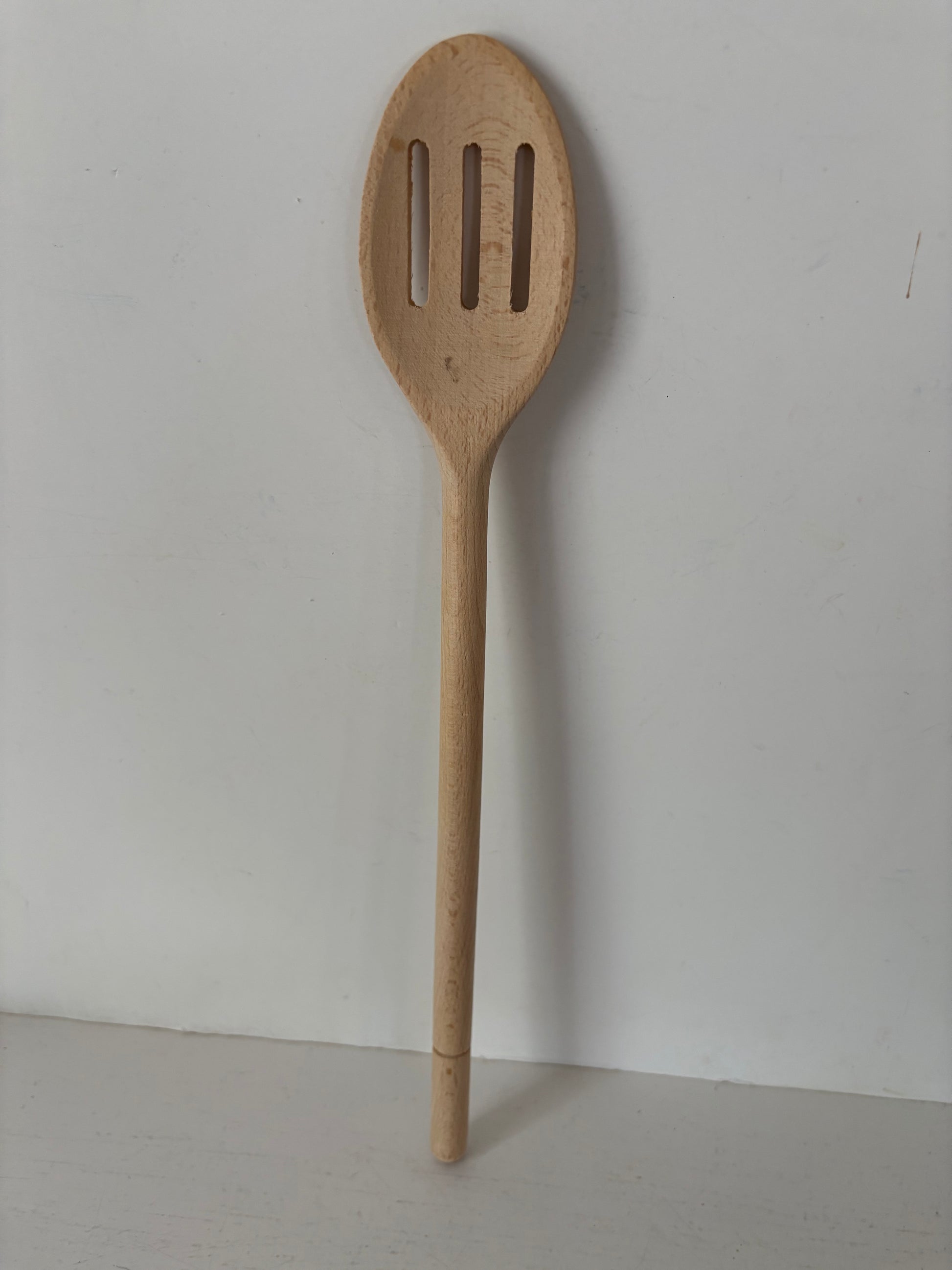 Fourteen-inch slotted wooden spoon. Ideal for any kind of mixing or stirring. Heavy and sturdy.