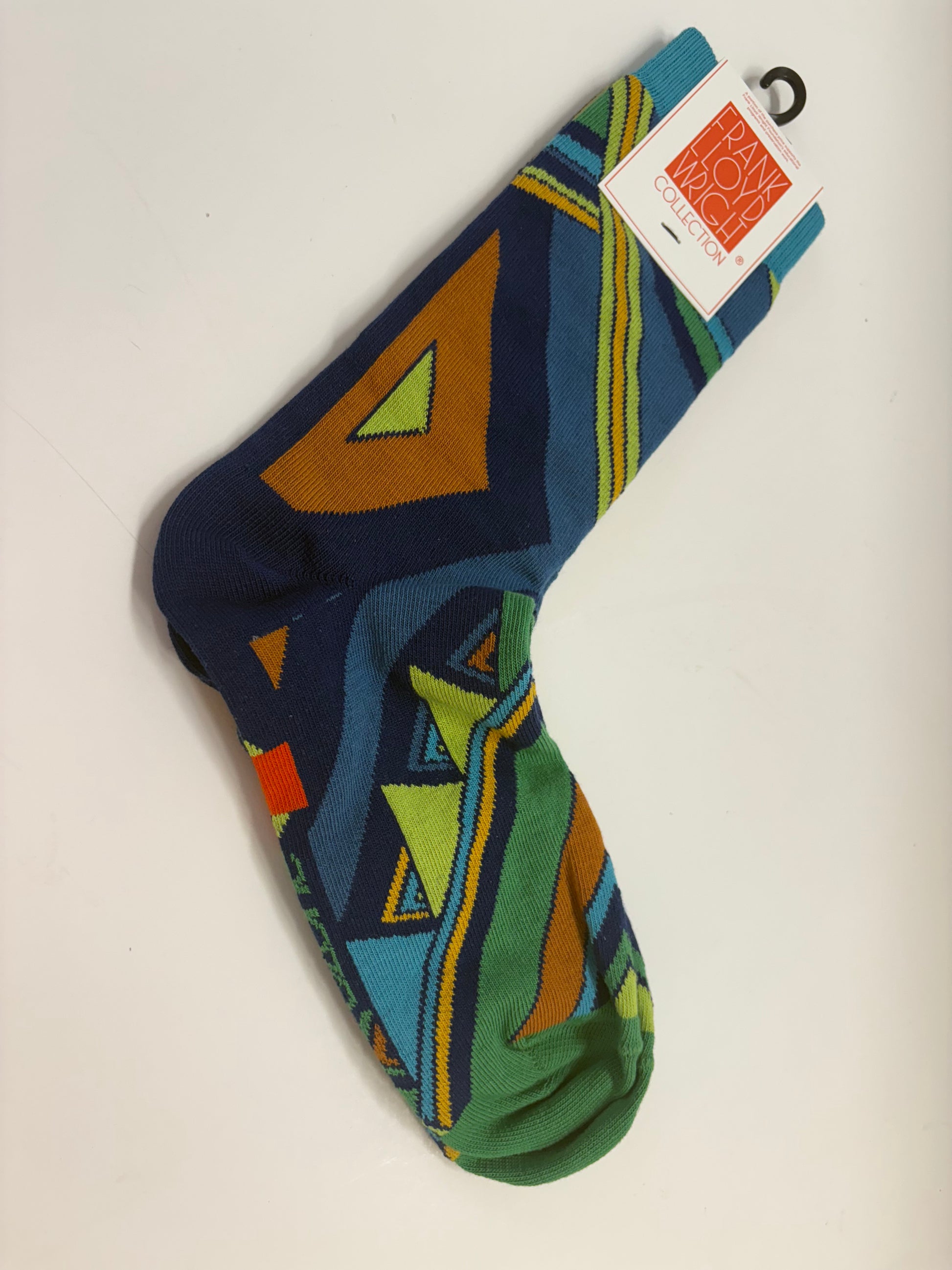 A fun and colorful socks with a Frank Lloyd Wright design. Browns, greens, and blue make it easy to wear with most clothes. One size fits all.