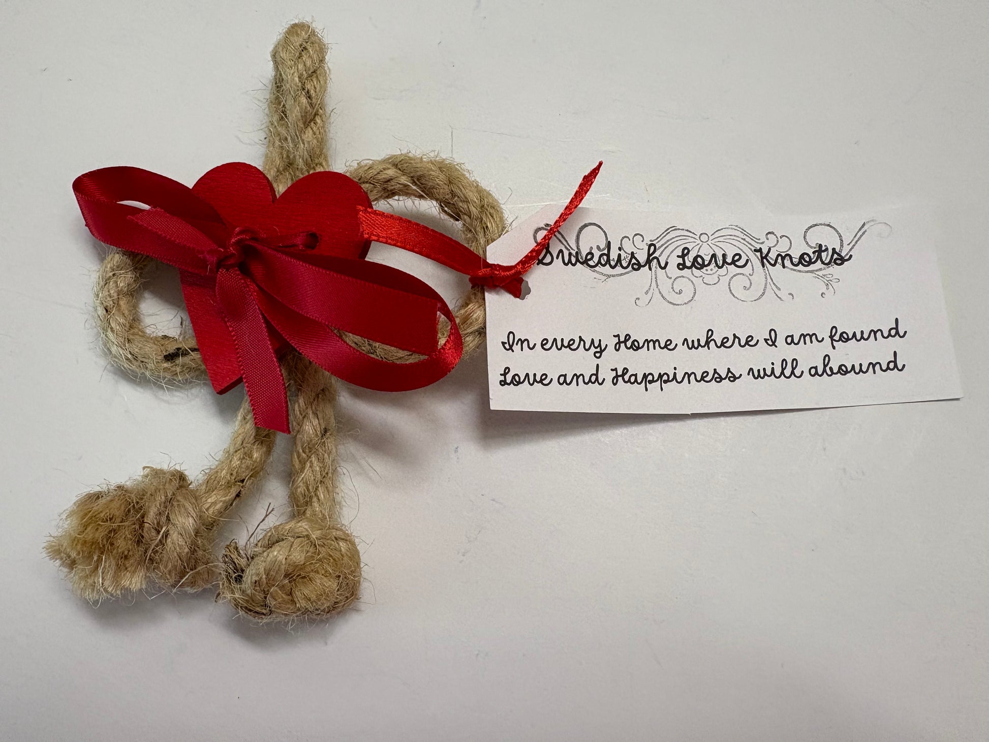 Swedish Love Knot with red heart. Handmade by Jackie. About 8" long but may vary in size. "In every home when I am found, Love and Happiness will abound".