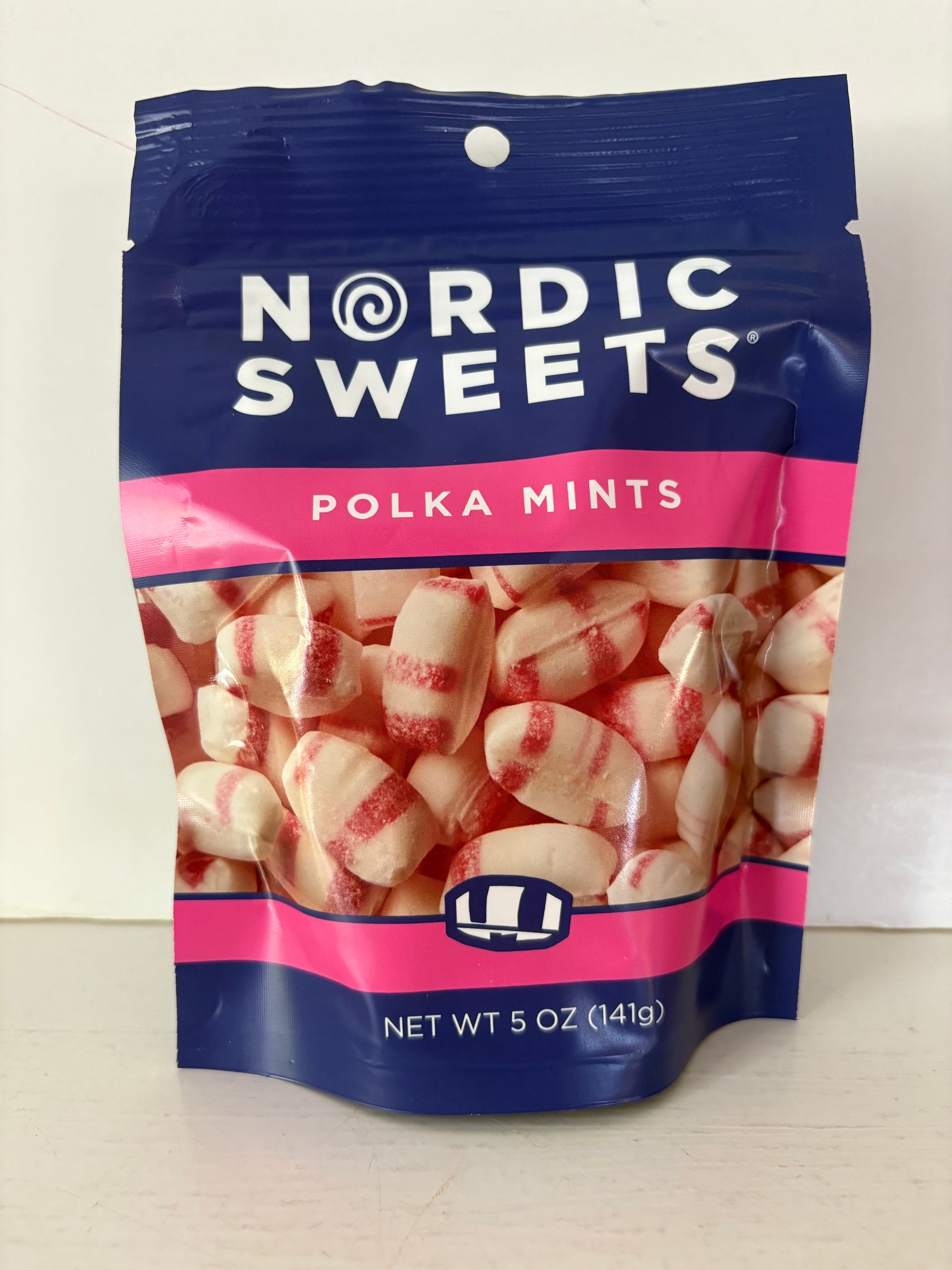 The traditional pink and white Swedish peppermint, (polkagrisar). It is full of peppermint flavor. Each package contains 5 ounces or 141 grams. The perfect ending to your dinner.